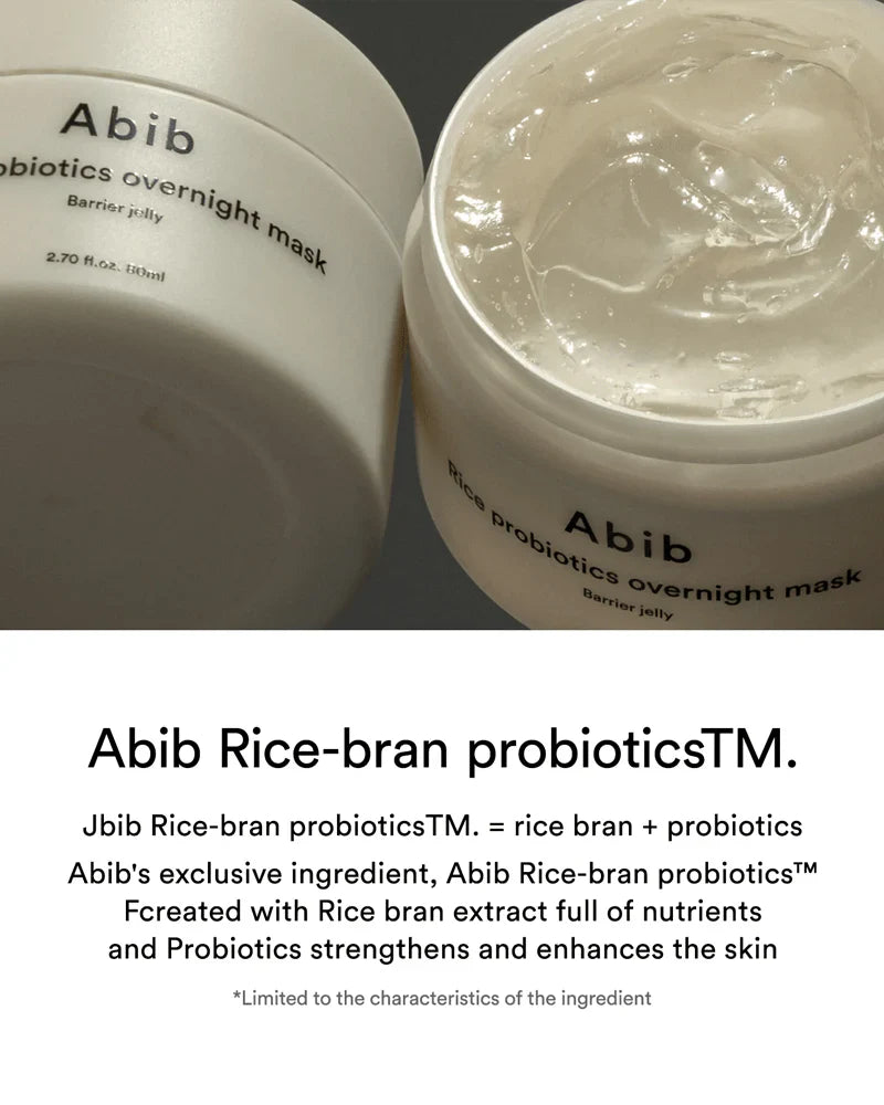 Ζήστε τα αναζωογονητικά οφέλη του Abib's Rice Probiotics Overnight Mask Barrier Jelly. Αυτή η μάσκα νυκτός, με την παχιά, πλούσια υφή ζελέ, προσφέρει τα απαραίτητα θρεπτικά συστατικά στο κουρασμένο δέρμα, αποκαθιστώντας μια σφριγηλή και υγιή επιδερμίδα.