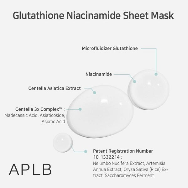 Η sheet μάσκα APLB Glutathione Niacinamide έχει σχεδιαστεί για βαθιά ενυδάτωση και ελαστικότητα του δέρματος, χρησιμοποιώντας γλουταθειόνη και νιασιναμίδη σε μέγεθος nano για ενίσχυση της απορρόφησης και της πρόσφυσης. Διαθέτει εκχύλισμα ρυζιού για καταπραϋντικές ιδιότητες και λαμπρυντικά αποτελέσματα.