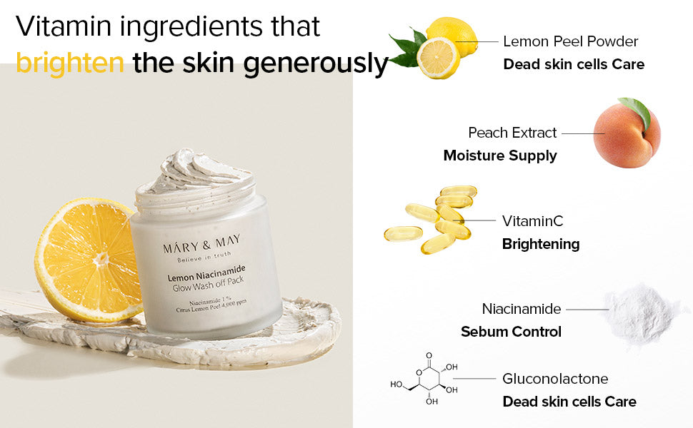 Ζήστε την αναζωογονητική λάμψη με τη μάσκα καθαρισμού Lemon Niacinamide Glow Wash Off Pack της MARY & MAY, μια μάσκα αργίλου εμπνευσμένη από spa.