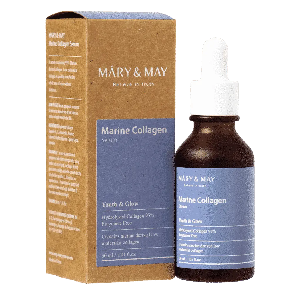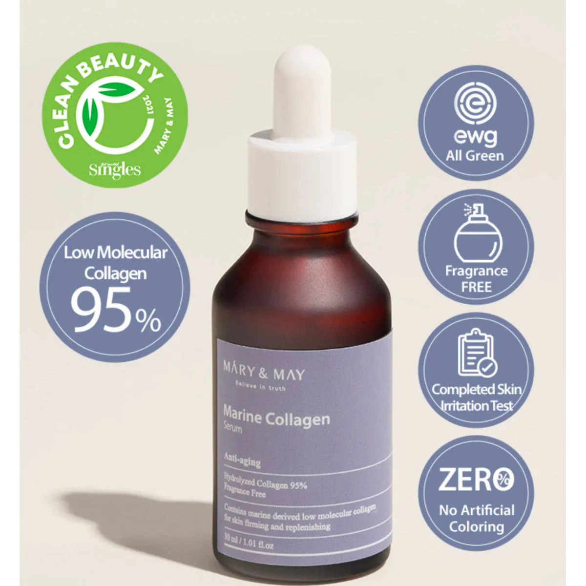 Ενισχύστε τη ρουτίνα περιποίησης της επιδερμίδας σας με τον ορό Marine Collagen της MARY & MAY, με 95% θαλάσσιο κολλαγόνο.