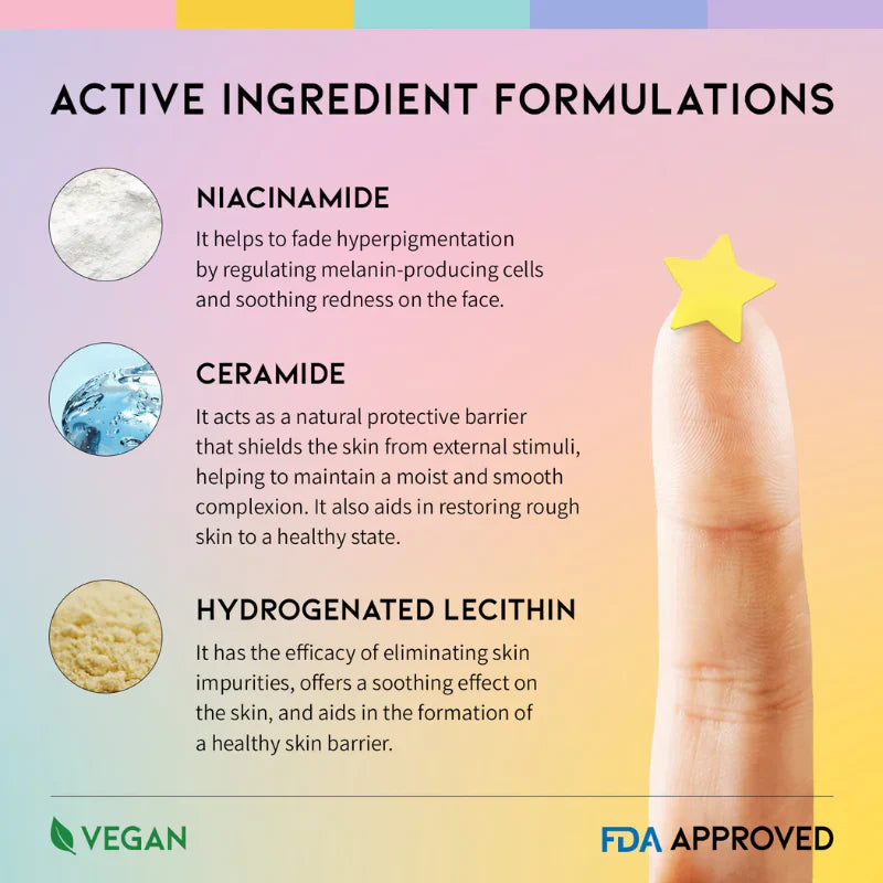 Patches σε σχήμα αστεριού σε 5 διαφορετικά χρώματα. Κάθε patch περιέχει Νιασιναμίδη και Ceramide NP, που βοηθούν στη μείωση της ερυθρότητας, την καταπολέμηση της υπερμελάγχρωσης και την ενίσχυση του δερματικού φραγμού.