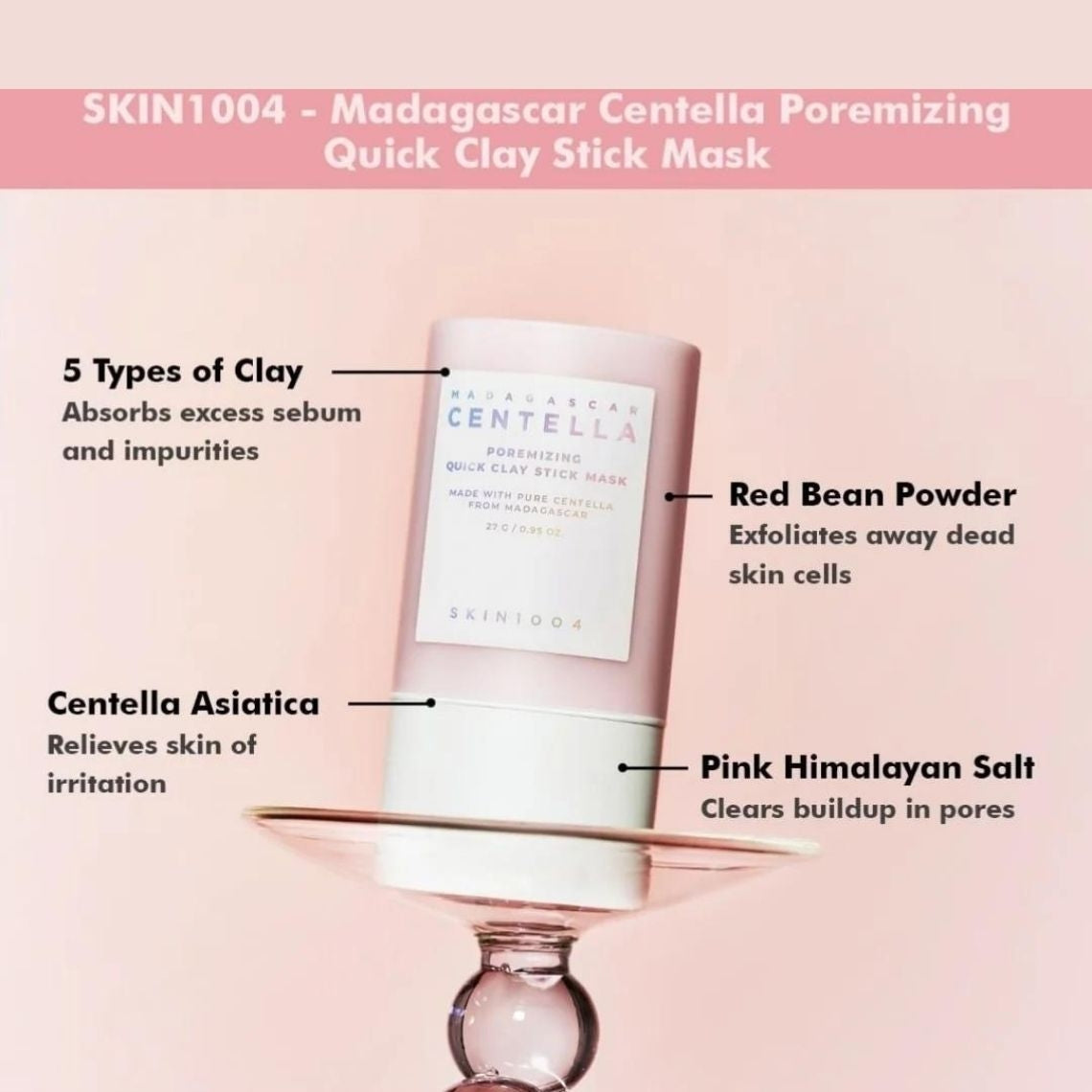 Η σκόνη κόκκινων φασολιών και 5 είδη αργίλου, συμπεριλαμβανομένης της λευκής λάσπης και 18% Καολίνη, βοηθούν στην εξάλειψη του υπερβολικού σμήγματος και των νεκρών κυττάρων του δέρματος για εκλεπτυσμένο δέρμα.Η Centella Asiatica, η Αλόη και η Καλαμίνη καταπραΰνουν το ερεθισμένο δέρμα και ενισχύουν τον φραγμό του δέρματος για να αφήσουν το δέρμα αναζωογονημένο.Το στικ έχει μια απαλή και υγρή υφή αργίλου που λιώνει κατά την επαφή με το δέρμα, αφήνοντάς τη λεία χωρίς την ακαταστασία των συμβατικών μασκών αργίλου