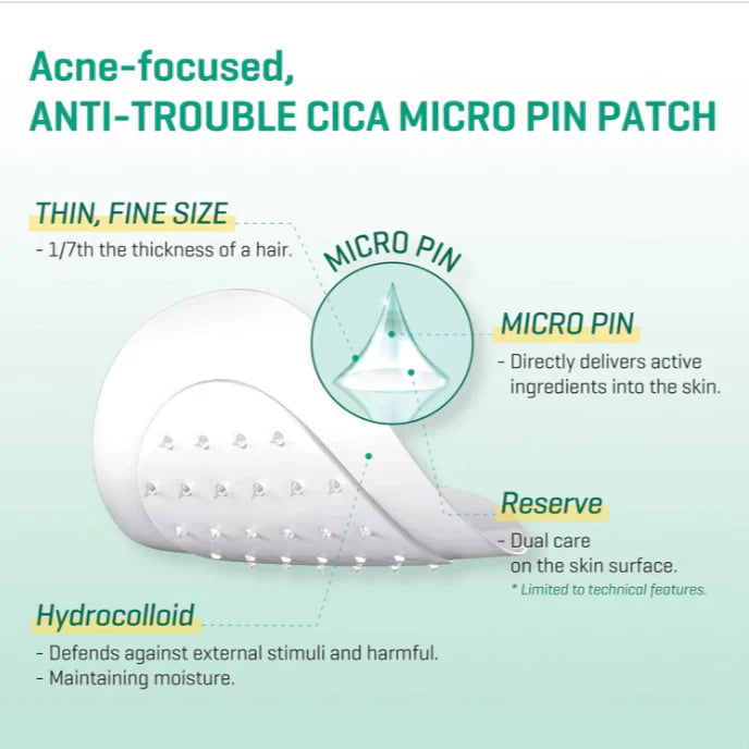 Το SOME BY MI Micro Pin Spot Patch έχει σχεδιαστεί για στοχευμένη φροντίδα της ακμής, χρησιμοποιώντας μικροβελόνες επικαλυμμένες με υαλουρονικό οξύ και Truecica™ για να προσφέρει καταπραϋντικά και ενυδατικά οφέλη απευθείας στο προβληματικό δέρμα.